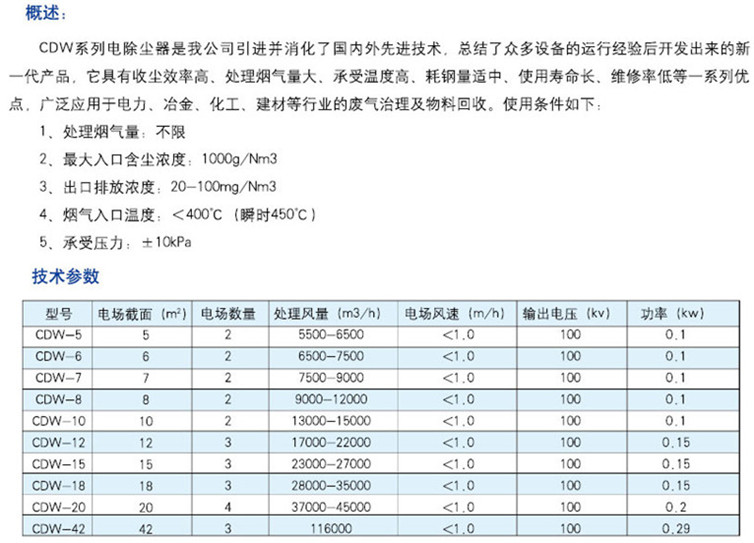 CDW系列電除塵器是我公司引進(jìn)并消化了國內(nèi)外先進(jìn)技術(shù),總結(jié)了眾多設(shè)備的運(yùn)行經(jīng)驗(yàn)后開發(fā)出來的新一代產(chǎn)品,它具有收塵效率高、處理煙氣量大、承受溫度高、耗鋼量適中、使用壽命長、維修率低等一系列優(yōu)點(diǎn),廣泛應(yīng)用于電力、冶金、化工、建材等行業(yè)的廢氣治理及物料回收。使用條件如下.1、處理煙氣量:不限;2、最大入口含塵濃度:1000g/Nm3;3、出口排放濃度:20-100mg/Nm3;4、煙氣入口溫度:<400C(瞬時450C);5、承受壓力:土10kPa。